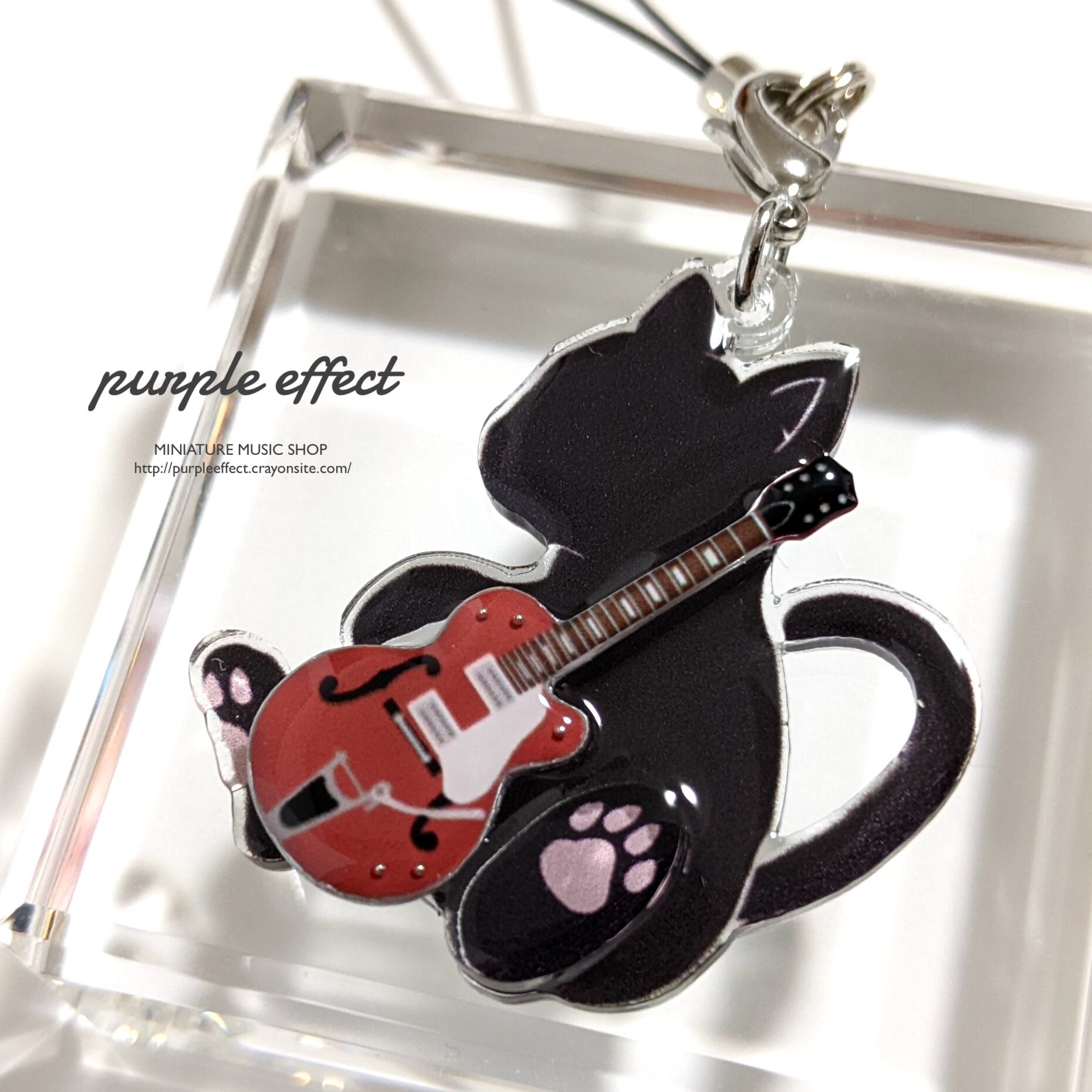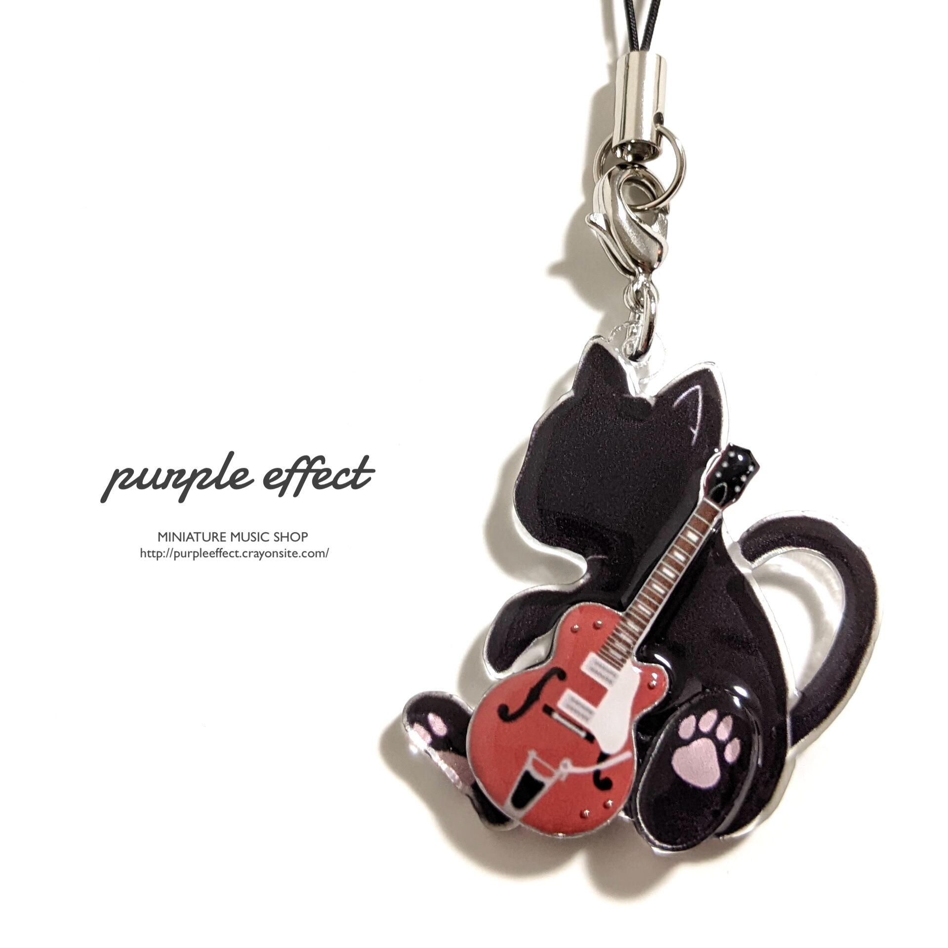 ギター部分と本体の猫チャーム部分を別々に制作しているので、チャームの上でギターの厚みを感じられる、立体的な造りとなっています。