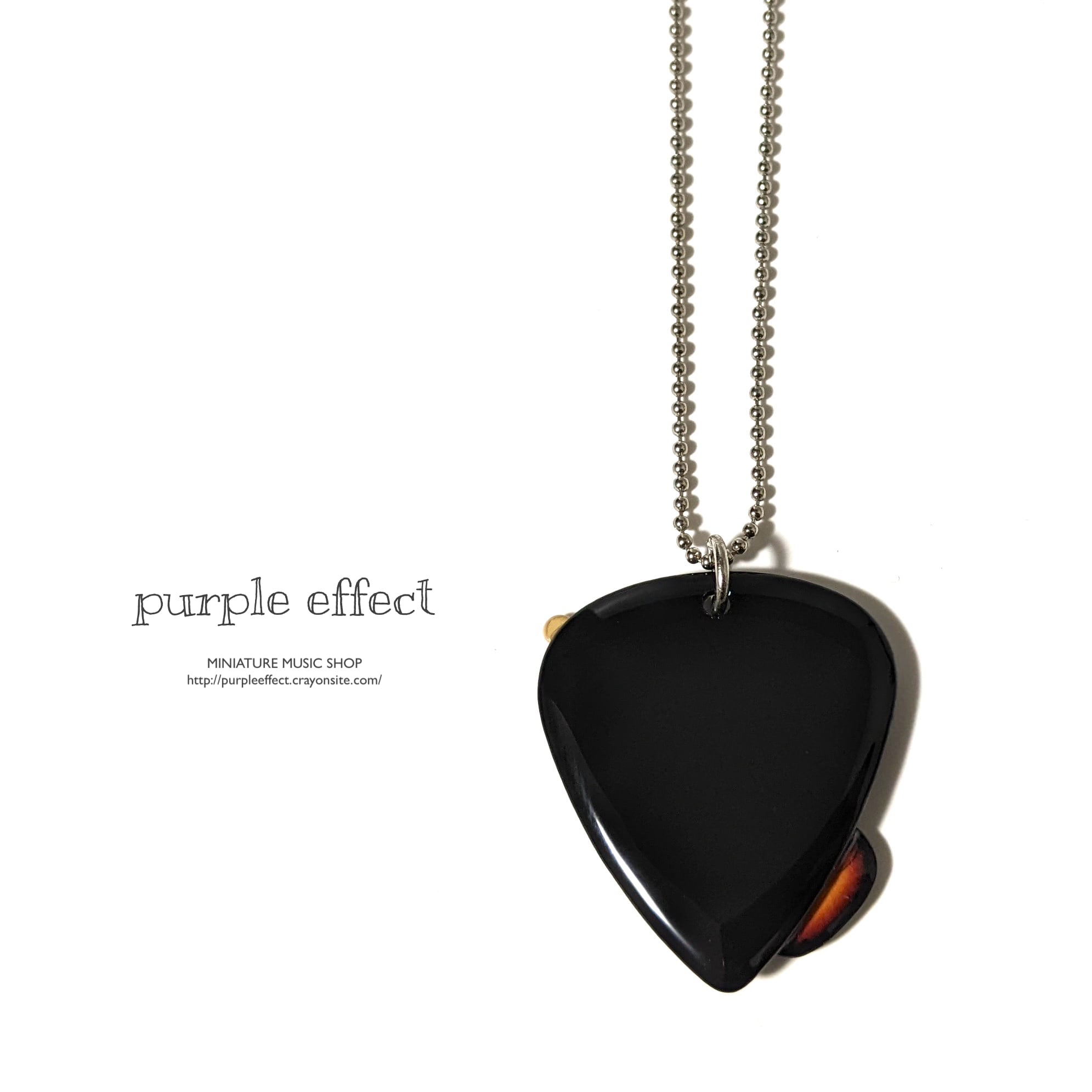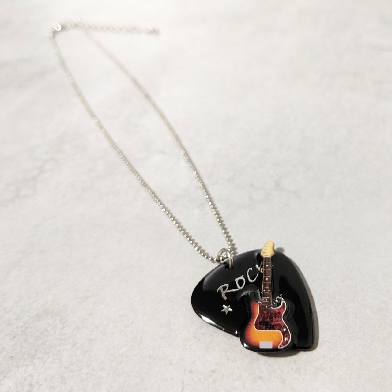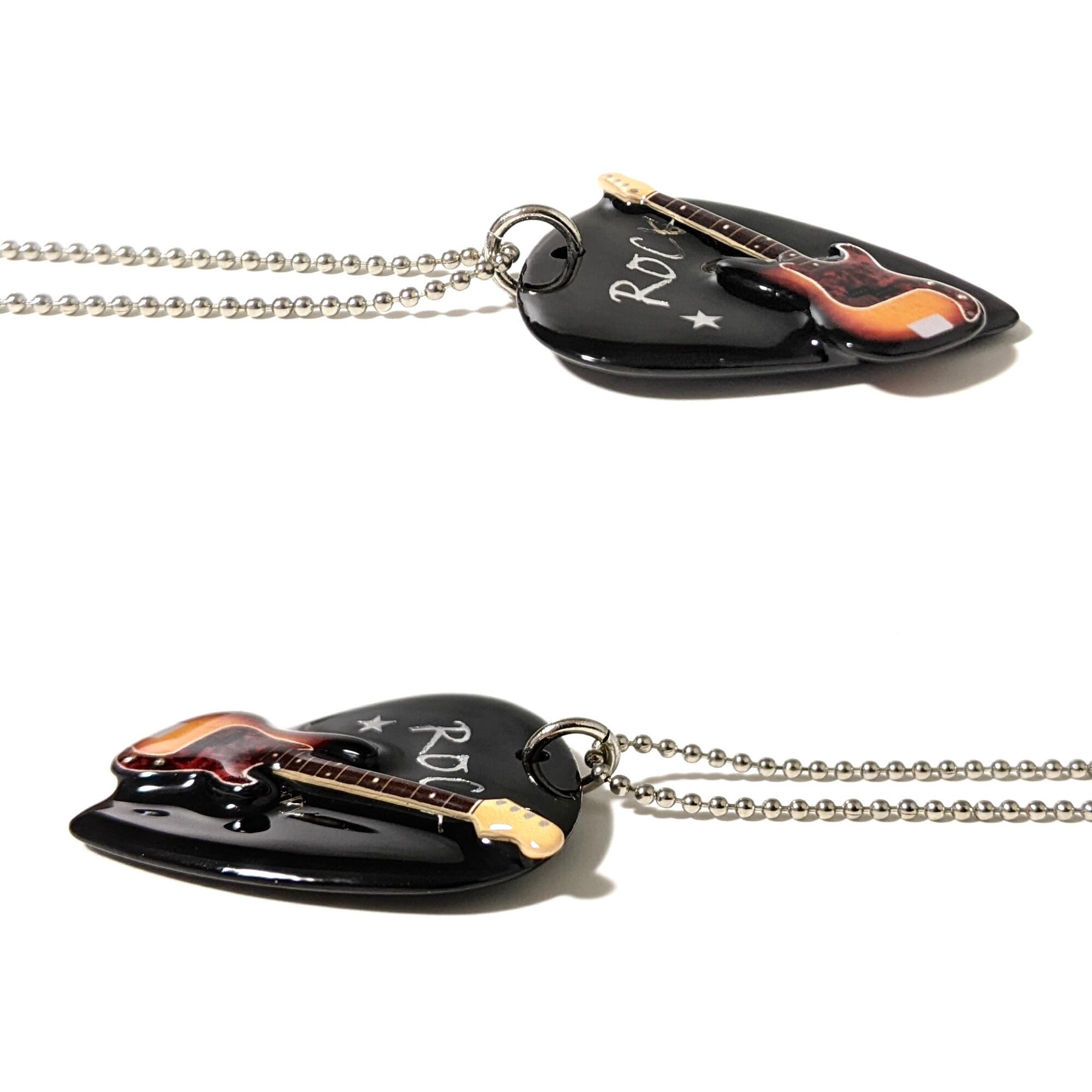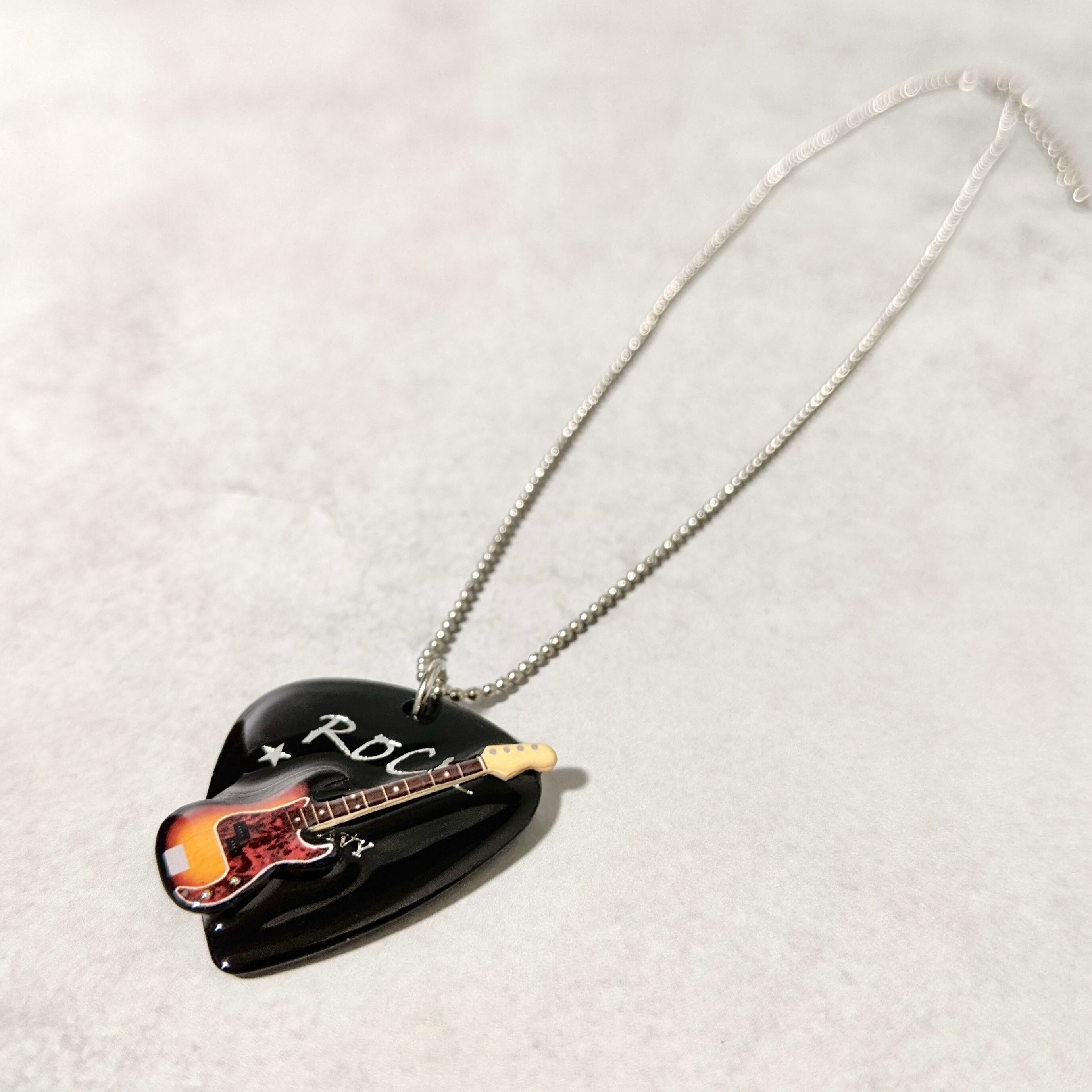 小さなサイズのベースとピックを組み合わせた、スタイリッシュなネックレスです。